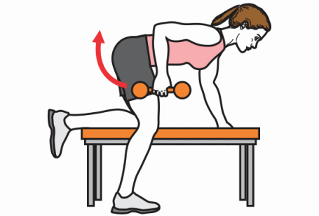 - On a bench, do tricep extensions with a neutral grip (or hammer). Place the foot on the ground on the side of the working arm. Keep your elbow close to the body and your back straight.