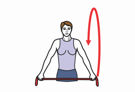 Stand and hold a band in front of you at hip height (overhand grip). Pull the band apart slightly. From here flex your shoulders, rolling the band over the top of your head as far as comfortable. Ideally you should be able to roll all the way over and touch the band to your back or buttocks. Return to start position. Do not flare your ribs throughout the movement, keep abs tight.