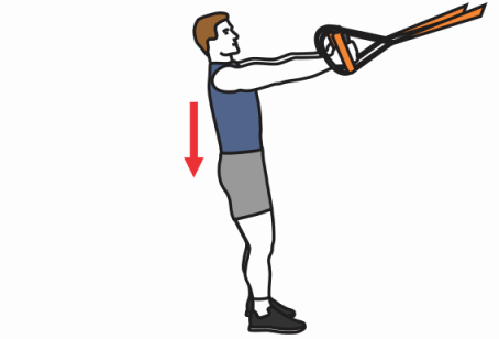 - Hold the TRX handles with 2 hands, stand on both feet, shoulder width apart. Tilt the body backwards and go down keeping the legs perpendicular to the ground (knees above the ankles). Keep your back straight and abs tight.