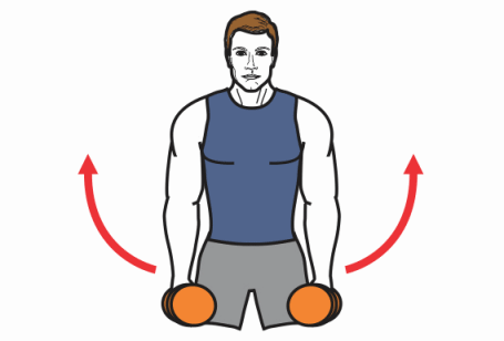 - Empieza de pie, con las rodillas ligeramente flexionadas y la espalda recta. Sostenga una mancuerna en cada mano a su lado con un agarre neutral. Levante las cargas de cada lado hasta la altura de los hombros y luego baje las cargas hacia el lado. A continuación, levante las cargas por delante de los hombros. Mantén los codos ligeramente flexionados y los abdominales apretados. Repite la secuencia.